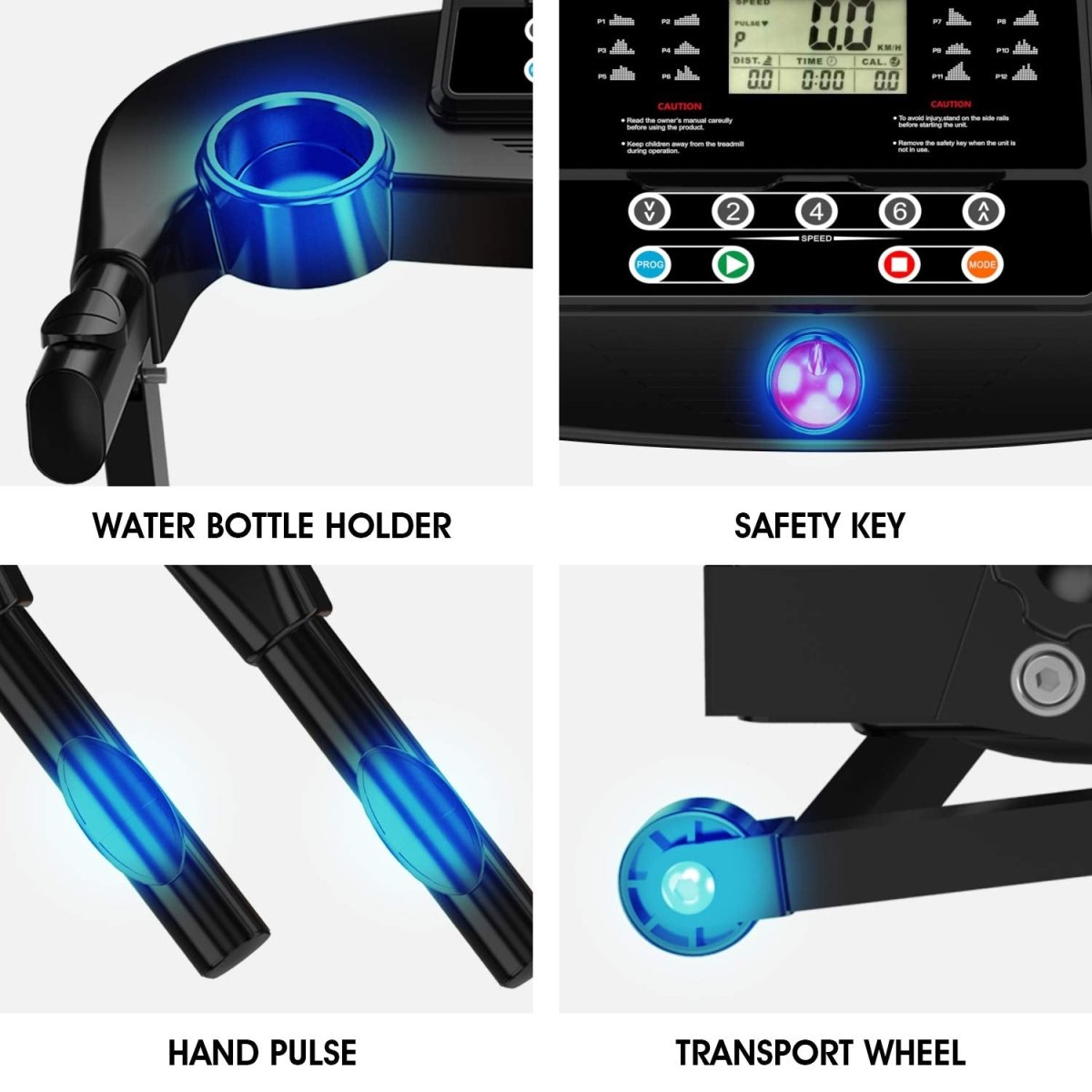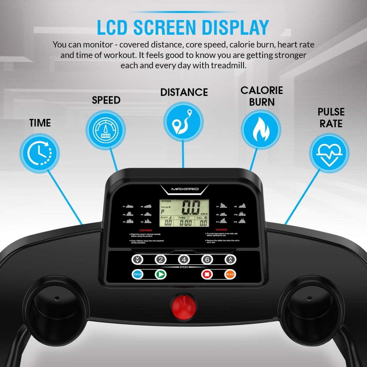 - LCD screen displaying time elapsed, distance covered, speed, calorie burned, and pulse rate Running surface.