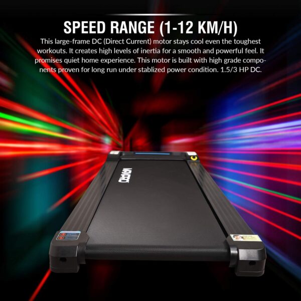 - Automatic Oil Lubrication: It helps to deliver controlled amounts of lubricant oil to multiple locations on a treadmill easily Motor – Powerful 1.5HP (3.0HP Peak) motor that is manufactured to be whisper silent with formulated multi-layer shielding, reaching top speeds of 12 km/h. Soft large running belt, durable steel frame make up the treadmill’s shock reduction & noise reduction system, make you’re running quiet & comfortable!