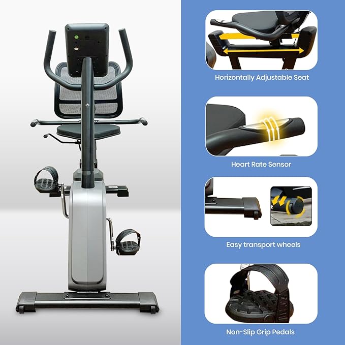- Crafted with Precision : Recumbent bike for seniors and adults prioritizes your well-being. Its contoured, cushioned seat and backrest provides lumbar support, ensuring a comfortable and strain-free workout session. The adjustable seat caters to all body types, allowing for a customization fit that encourages proper posture and reduces the risk of discomfort or strain.