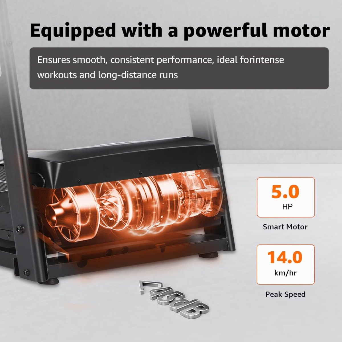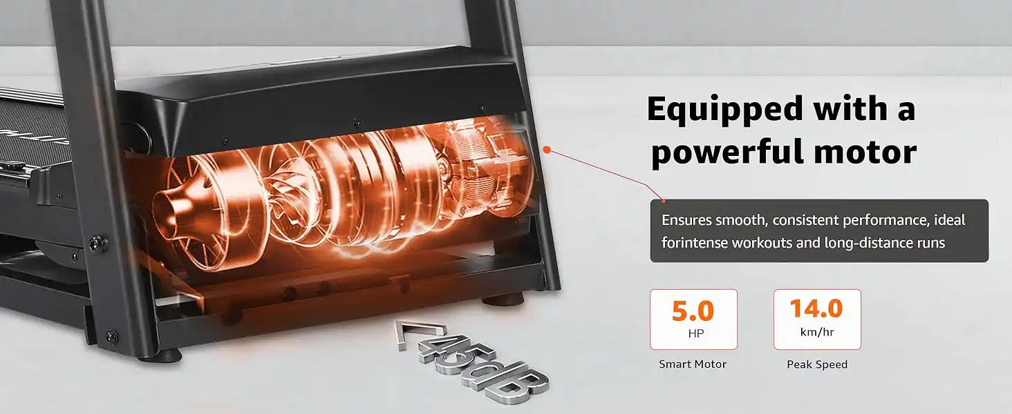 Durable, silent DC Motor - For a noise-free workout, the high-end treadmill features a 5.0 High Peak Motor that ensures stability and a sturdy frame that supports up to 110 kg. You can effortlessly transition between a leisurely walk and a strenuous sprint by changing the speed limit from 1–14 km/h.