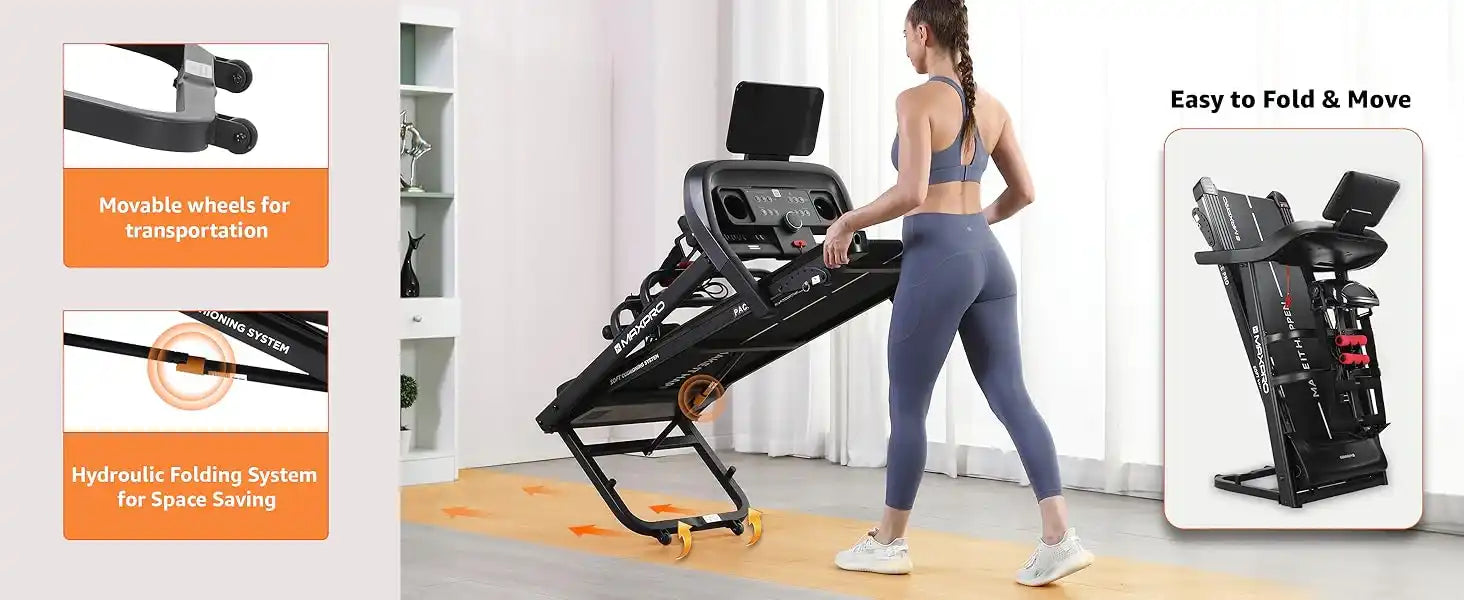Space-saving foldable design - Bring home a compact, space-saving daily workout treadmill with a hydraulic folding system that makes it easy to fold and store, along with a soft, cushioned deck for pain-free running.
