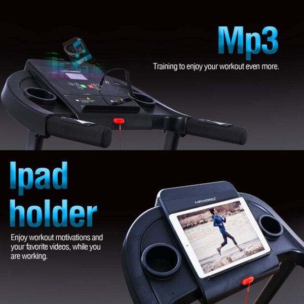 - 【MULTIFUNCTIONAL TREADMILL】The multifunctional LCD display tracks your performance including time, calorie, speed, distance and pulse, promising a superior and effective home treadmill workout. You could put your mobile phone or pad on the holder and talk with your friends or watch movies when you work out. Built In Speakers & Audio iPhone/MP3 Connections